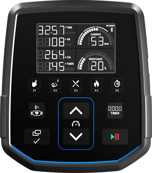 | ANZEIGEN | Widerstand, Kadenz, Herzfrequenz, Zeit, Distanz, Kalorien, Geschwindigkeit |