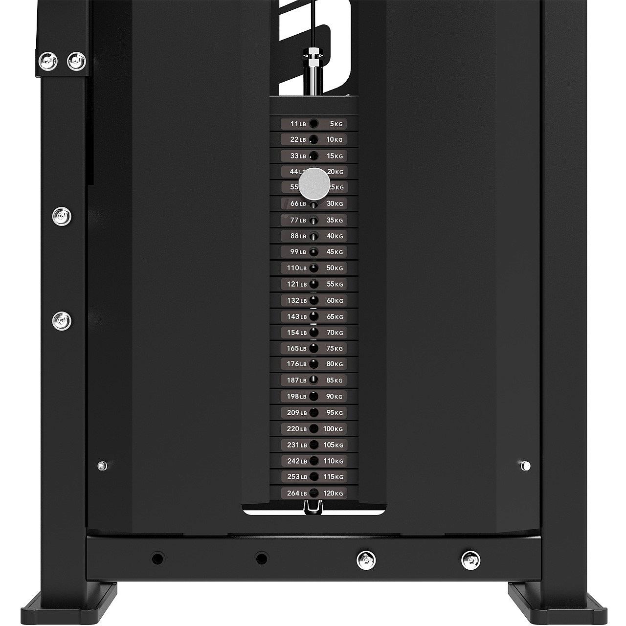 Kraftvoller WiderstandGewichtsstapel bis zu 120 kg, ergänzt durch ein zusätzliches 2.5-kg-Element für präzise Progression in 2.5-kg- oder 5-kg-Schritten.