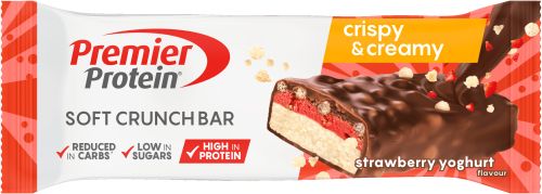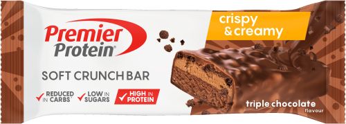 Beim Premier Protein Soft Crunch Bar treffen zwei ultra-softe, cremige Proteinschichten auf knusprige Crispies –umhüllt von zarter Schokolade – und das ganz ohne Palmöl und Kollagen. Purer Genuss bei 1,5 g Zucker und einem hohen Proteingehalt von 12 g